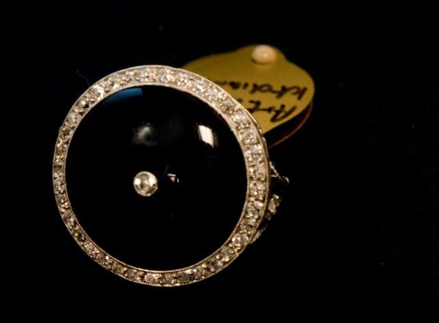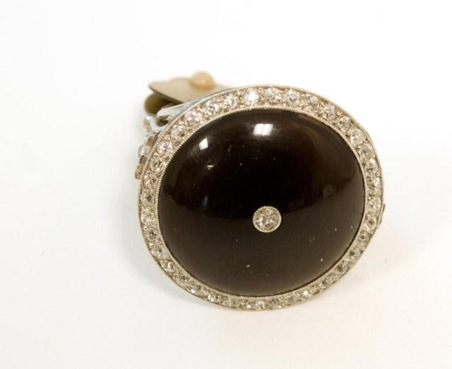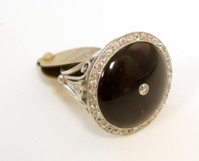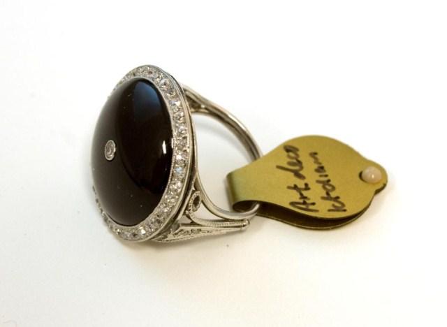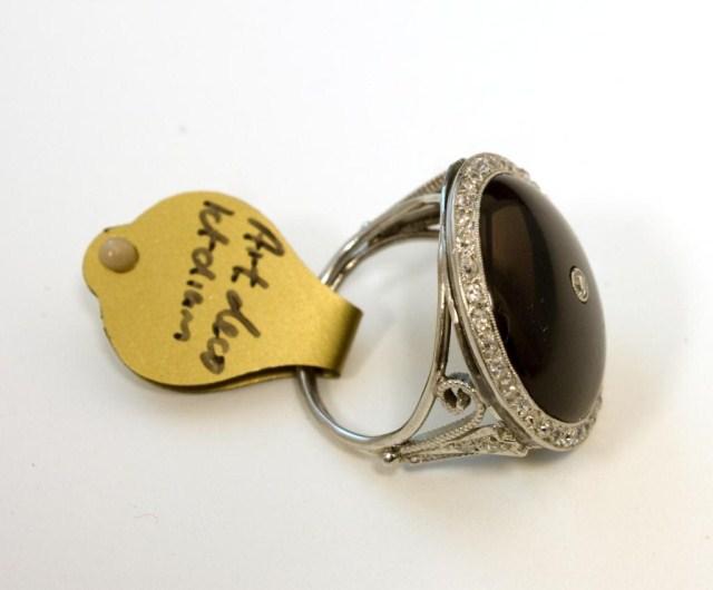 Ladies art deco white gold diamond and onyx with approximately 1ct diamonds. Ring size 5 1/4".