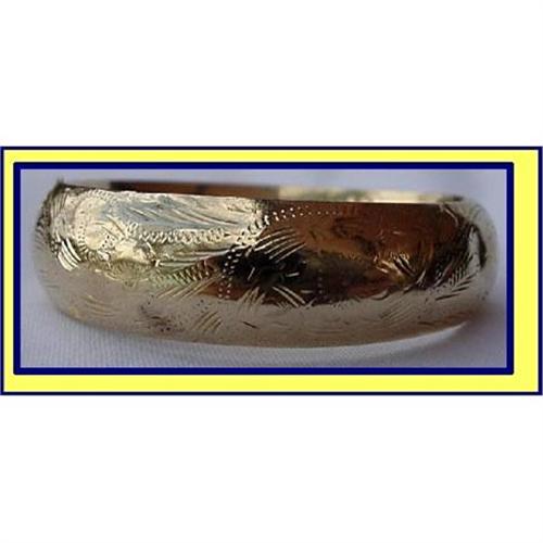 Jewelry Engraved 14 karat yellow gold bracelet bangle, probably late 19th century, Victorian. Approx 2 3/4inches accross and weighs about 1oz. Profusely engraved with fine patterns. Hinge in good order for opening and hidden insert inside part that opens to prevent it from falling off completely. Great quality. Tiny ding in no way detracts from otherwise excellent condition and is to be expected in gold of this high quality. Inner 'band' is marked 14 karat.