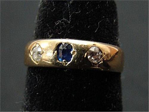 LADIES’ DIAMOND RING. Contains 2 small diamonds surrounding a blue colored stone.