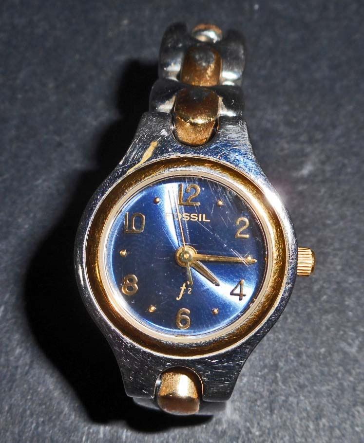 The back plate reads 'F2 Fossil ES-8949 110104 Solid Stainless Steel Water Resistant 100 Feet / 30 Meters ce'. Needs a battery.