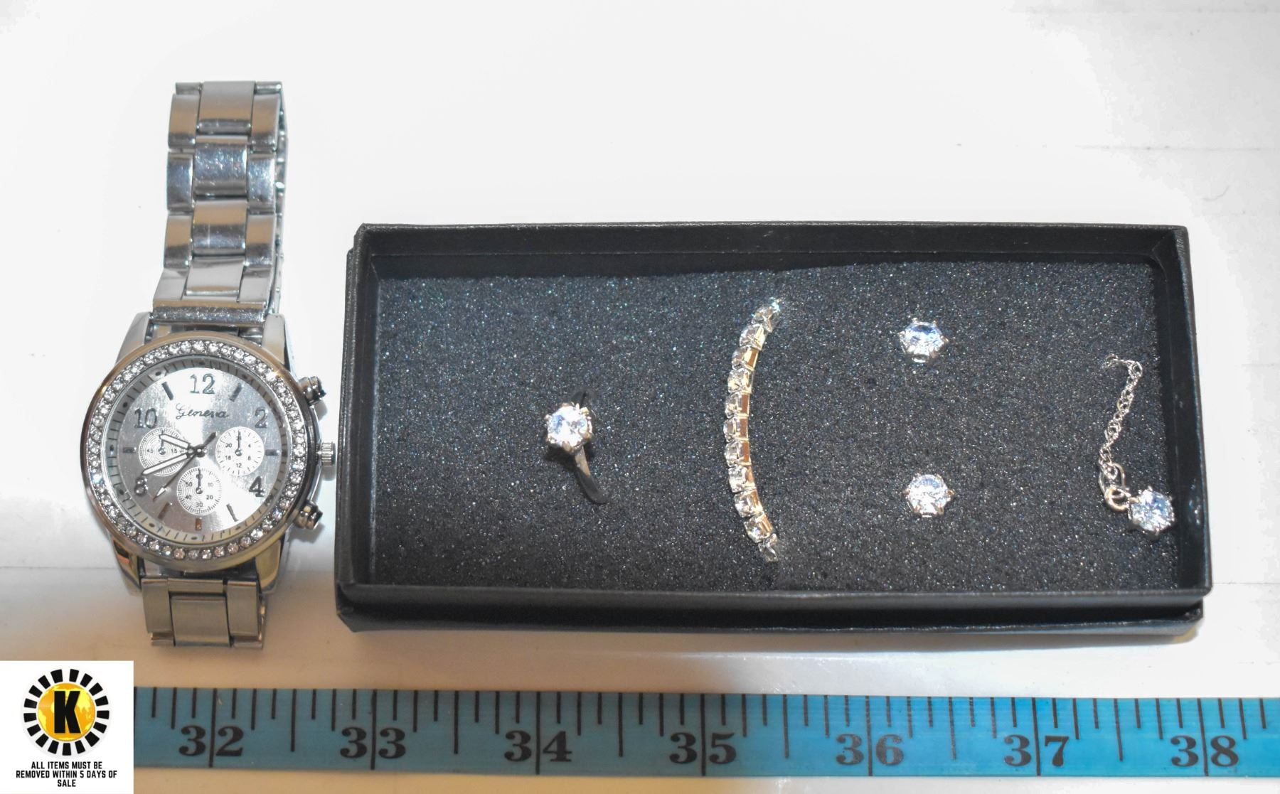 LADIES GENEVA WATCH, EARRING, NECKLACE, RING,