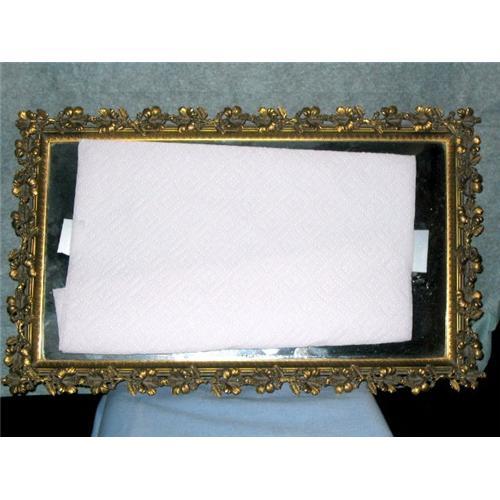 WONDERFUL LADIES DRESSING TABLE TRAY. THE GILDED FLORAL DESIGN AROUND THE EDGES ARE DONE VERY WELL. ALSO THERE ARE ETCHED TRIMMIMGS AROUND THE LOWER RIM UNDER THE TOP, BACKED WITH VELVET. THE MIRROR IS CRACKED BUT IT IS VERY EASY TO REPLACE. THE GILDING IS ALL INTACT AND REALLY SHINES UP VERY NICELY.