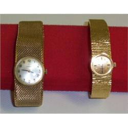 LADIES GOLD OMEGA ROUND FACED WATCH, on a wide gold strap, with the orginal guarantee. 100 - 200...