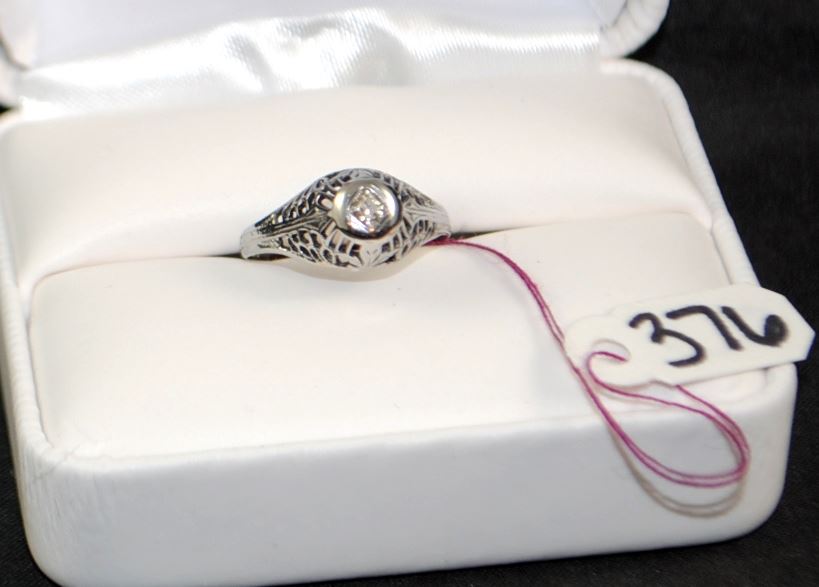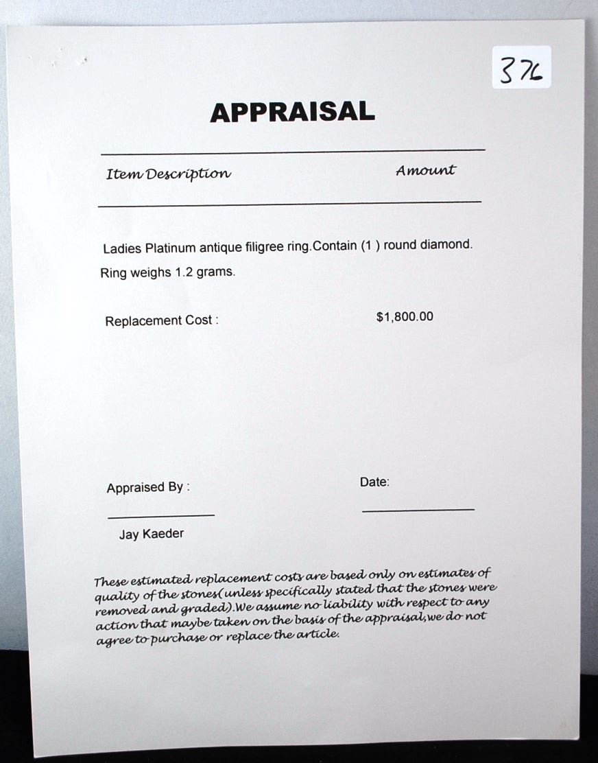 LADIES "PLATINUM" ANTIQUE FILIGREE DIAMOND RING WITH 1 ROUND DIAMOND. THE APPRAISED REPLACEMENT COST IS $1,800.00. AND COMES WITH THE APPRAISAL FOR INSURANCE.