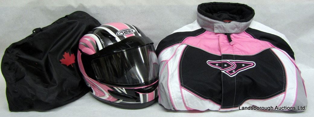 WOMEN'S FXR RACER GIRL JACKET IN SIZE 14, XL. HIDDEN ADJUSTABLE SHOCK CORD WAIST FOR CUSTOM FIT. MATCHING G-MAX HELMET, SIZE MEDIUM, 57-58 CM. STYLE NUMBER GM-44X 15MM. COMES WITH HELMET BAG. ALL IN EXCELLENT PRE-OWNED CONDITION, SHOWING VERY LITTLE WEAR.