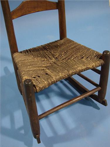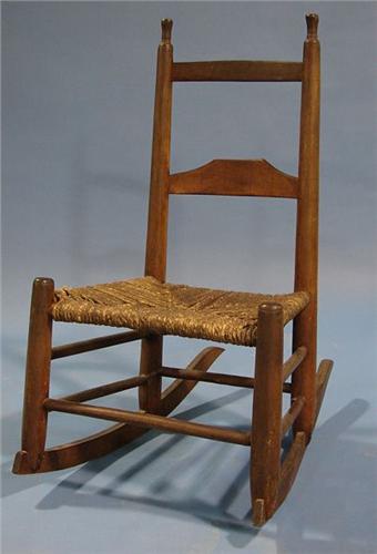 LADIES’ RUSH BOTTOM LADDER BACK ROCKER. Two splat back with finials. 33” H to top of back. 18.5” W