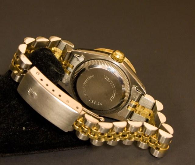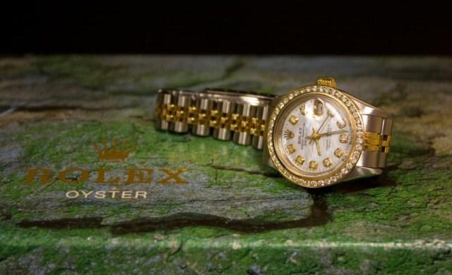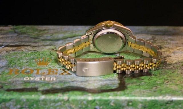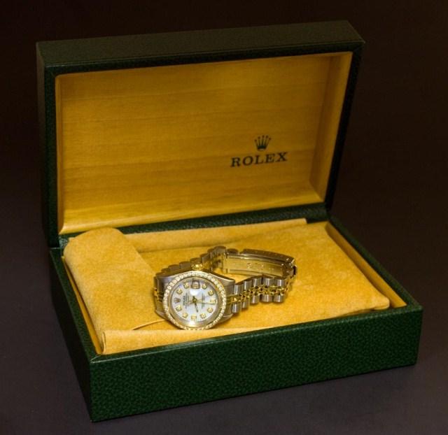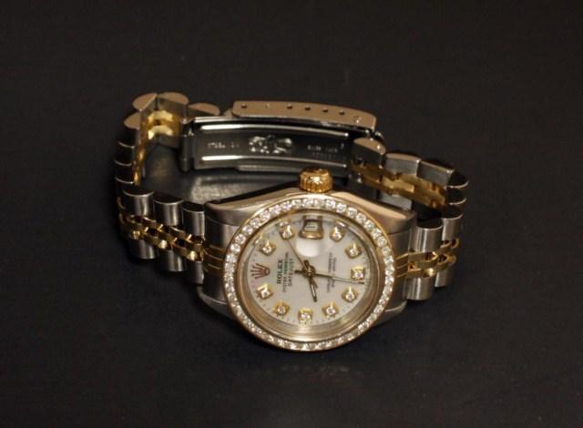 Ladies Rolex Datejust two tone watch. Aftermarket diamond dial and diamond bezel. 17 links.