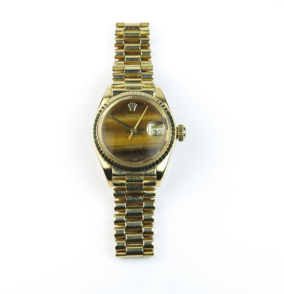 Nice ladies 26MM 18karat gold President Date Just Rolex with Tigers eye dial in good condition. Cheapest on Ebay is around $5,400.00. Est:$5000-7000
