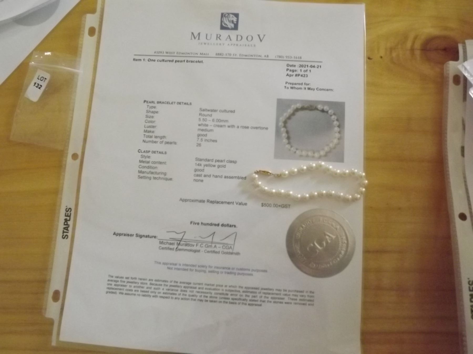 CLASP- ARV $500.00; SIZE 5.50- 6.00MM/ LENGTH 7.5 INCHES/ ROUND/ WHITE CREAM W/ ROSE OVERTONE. COMES WITH APPRAISAL