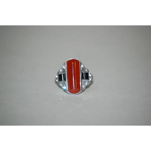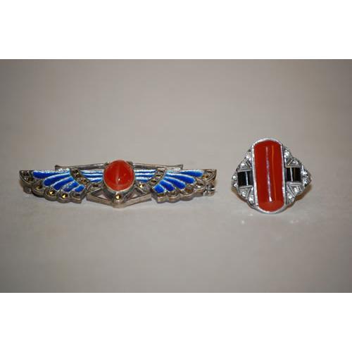 LADIES SILVER RING SET W/ A LOZENGE SHAPED CARNELLIAN<BR>FLANKED BY 2 BLACK ONYX IN A FILIGREE MOUNTING (MARKED<BR>OPHIR 935 GERMANY), TOGETHER W/ STERLING SILVER ART<BR>DECO STYLE BUTTERFLY PIN W/ BLUE ENAMEL & MARCASITE<BR>W/ CARNELLIAN BODY