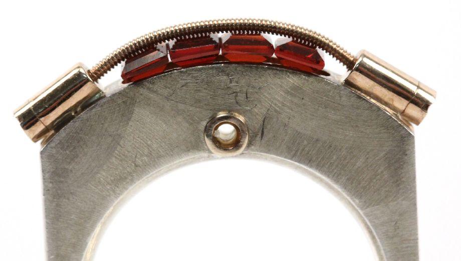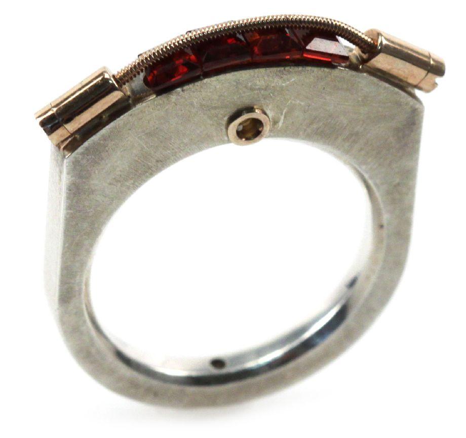 Industrial style sterling silver and 14K yellow gold ring by Plodowski with (4) square emerald cut garnets in Plodowski's patented tension setting. Rings from this designer retail for upwards of $400. Ring is signed on outer shank. . Size: 7 . Weight: 7.2 g . Condition: Very good