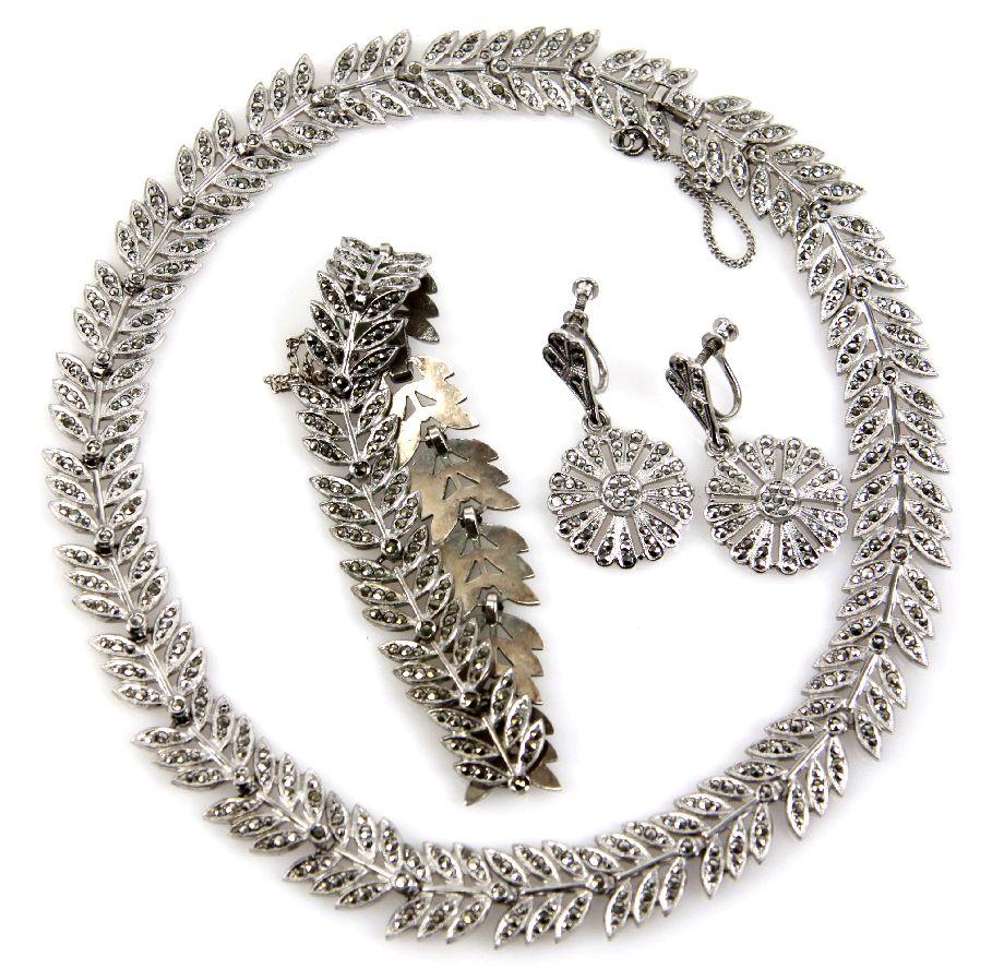 A vintage sterling silver and marcasite jewelry suite in a laurel pattern with 14.5 inch necklace, 6.5 inch bracelet, and a pair of screw-back earrings. Weight: 82.6 g Condition: Very good
