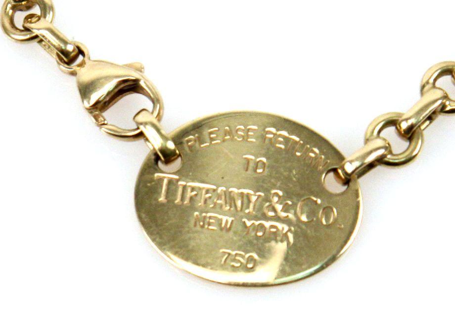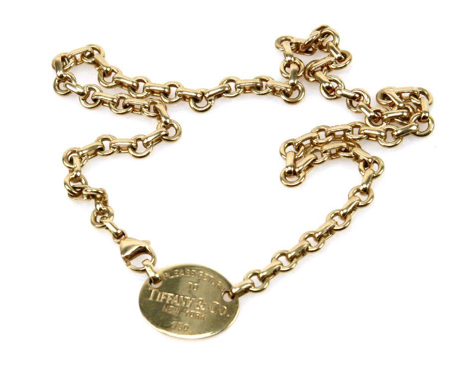 Ladies 18K yellow gold "Please Return To Tiffany & Co New York" oval tag choker with lobster claw clasp. . Size: 15.5 inches . Weight: 40.4 g . Condition: Very good with minor surface wear.