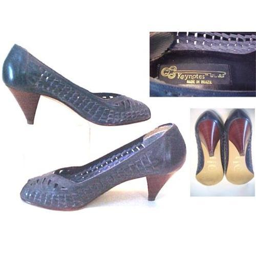 LADIES dress pumps of genuine leather, a vintage tailored pretty pair. Expensive quality shoes. Sz. 5-1/2B. Navy blue basketweave open strapwork, nice and cool for hot weather. 2.5" tapered stack heel. Padded insole. Worn only once and in perfect condition. Basketweave has give and is comfortable on your foot. Small size for petite feet very hard to find these days. Keynotes made in Brazil, 1980's. Mail in US add $6.