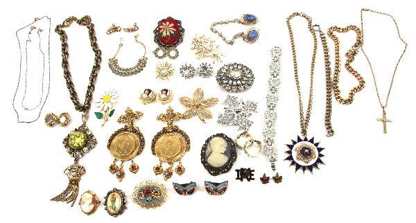 Collection of vintage jewelry, including an Eisenberg sterling pin and screw-back earring set (chips to a couple of the stones on the brooch) and pieces by Matise, Florenza, and Trifari. Weight: 2.17 ozt in sterling pieces Condition: Good with some wear