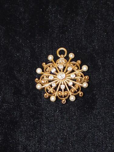 LADIES YELLOW GOLD 1" DIAMETER STARBURST DIAMOND & PEARL PIN/PENDANT SET W/ 8 PEARLS ON OUTER POINTS - CENTER DIAMOND APPROX. .2 CARATS SURROUNDED BY 8 DIAMONDS AT .04 CARATS EA. (APPROX. .5 CARAT TOTAL WEIGHT)