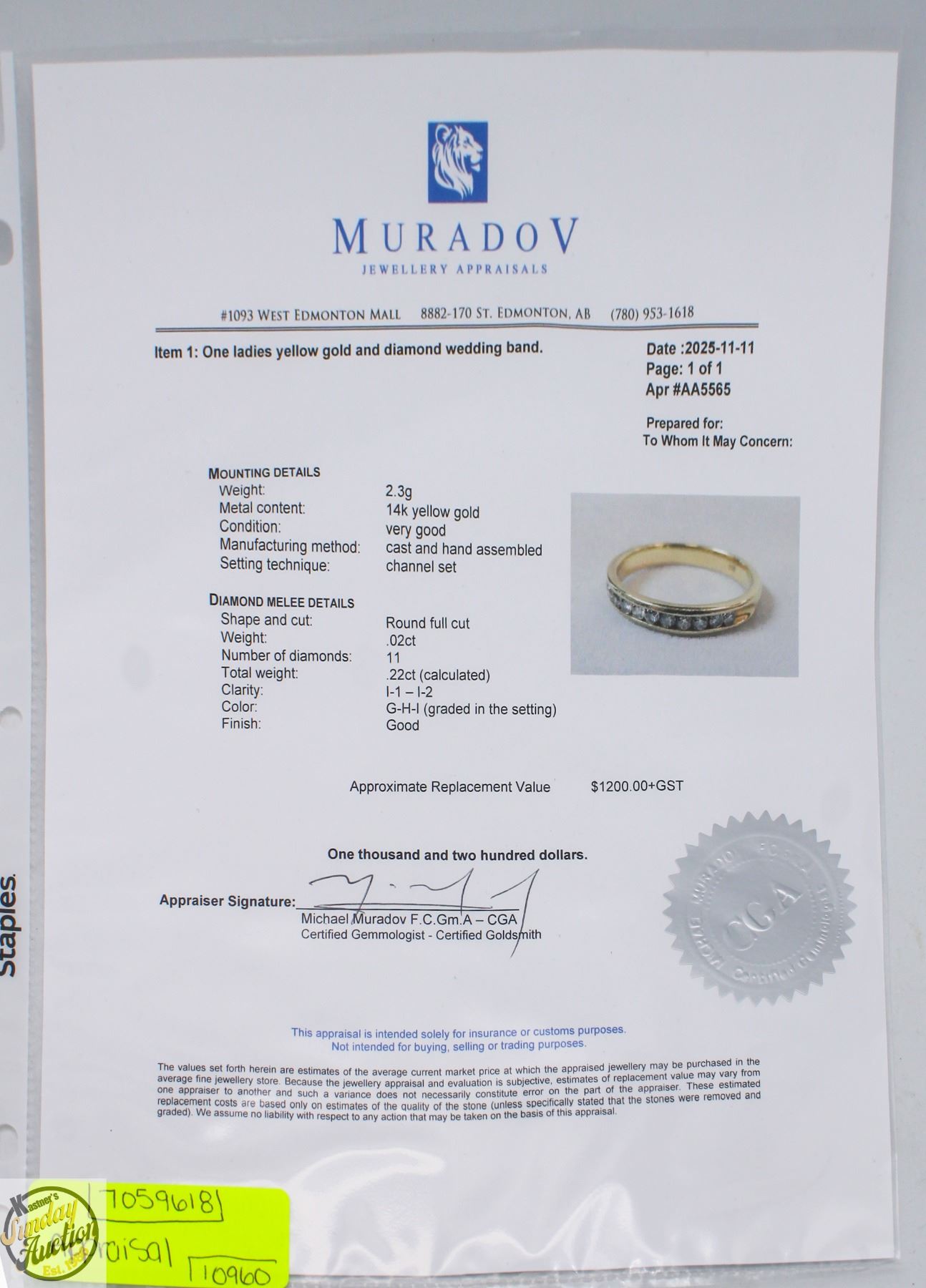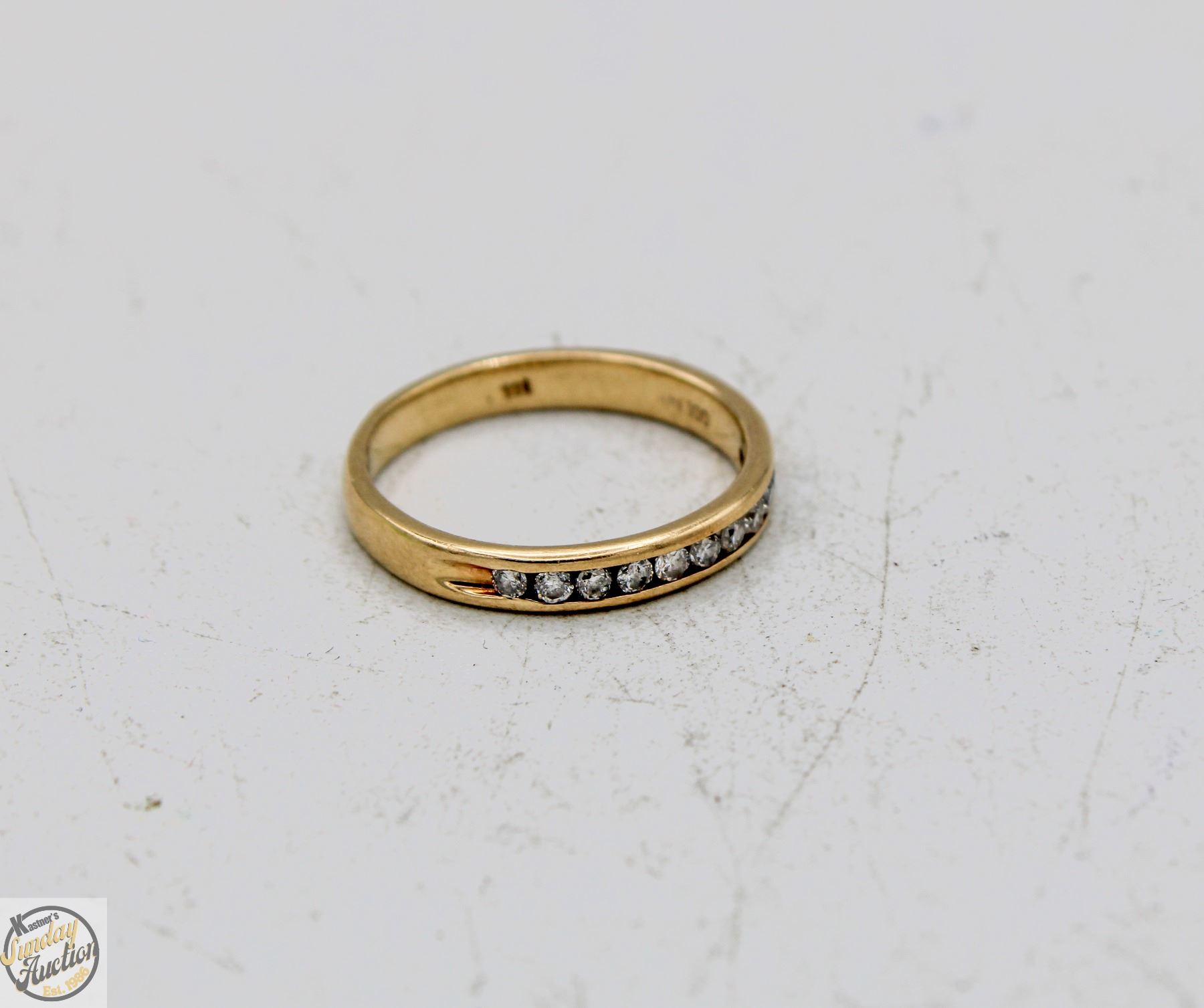 14K YELLOW GOLD CAST AND HAND ASSEMBLED CHANNEL SET RING WEIGHING 2.3G, DIAMOND MELEE CONSISTS OF 11 ROUND FULL CUT DIAMONDS WEIGHING 0.22CT (CALCULATED) WITH AVERAGE COLOR I-1 - I-2 AVERAGE COLOR G-H-I.