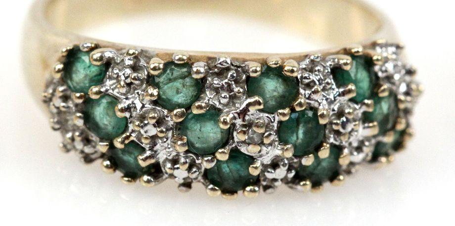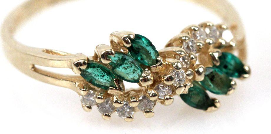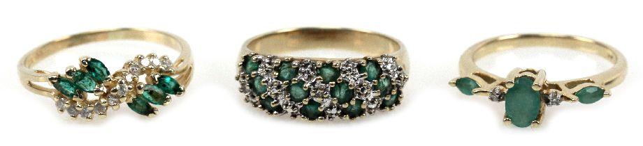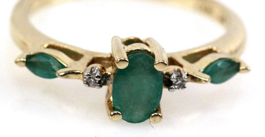 Ladies size 6 14K yellow gold ring with an approx 0.3ct oval cut center emerald, (2) 0.04ct marquise cut side emeralds. Ladies size 6.5 14K yellow gold with (6) approx. 0.02ct marquise cut emeralds with (11) 0.01ct round cut diamonds. Ladies size 7 10K ring with (12) 0.04ct round cut emeralds (one has small chip). . Size: 6-7 . Weight: 7.9 g . Condition: Very good