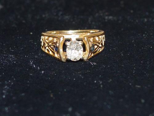 LADIES YELLOW GOLD MOUNTED OVAL CUT DIAMOND ENGAGEMENT RING - APPROX. 1/3 CARAT IN FILIGREE CATHEDRAL STYLE MOUNT W/ 2 BLUE SAPPHIRES SET IN SHOULDER