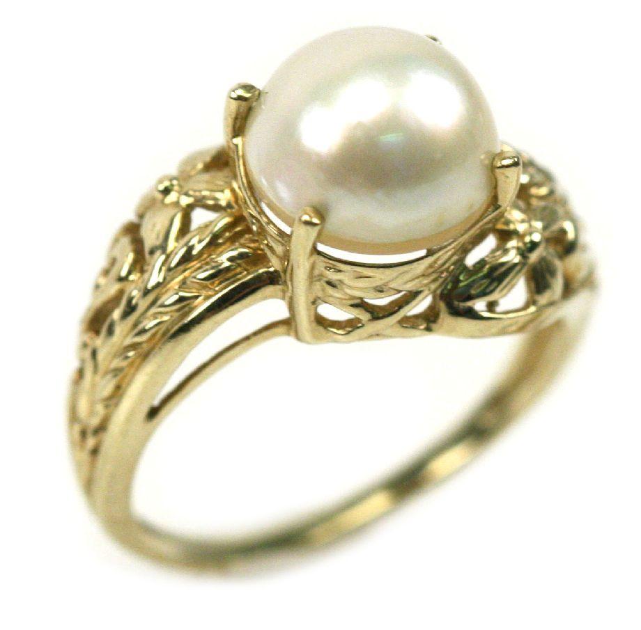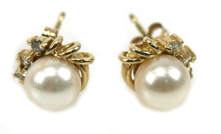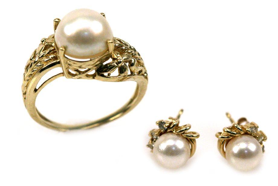 Ladies size 8.5 10K gold ring with a 10mm cream colored pearl and a pair of 14K gold stud earrings, each with a 6mm pearl and (3) diamond accents. . Weight: 6.7 g . Condition: Very good