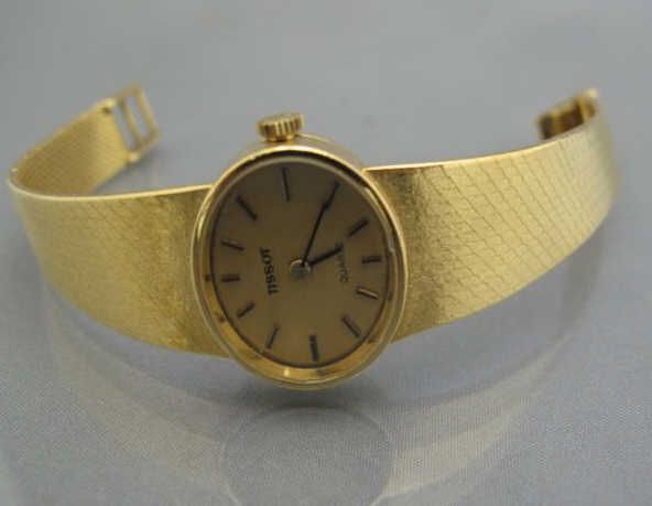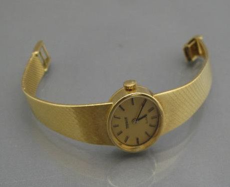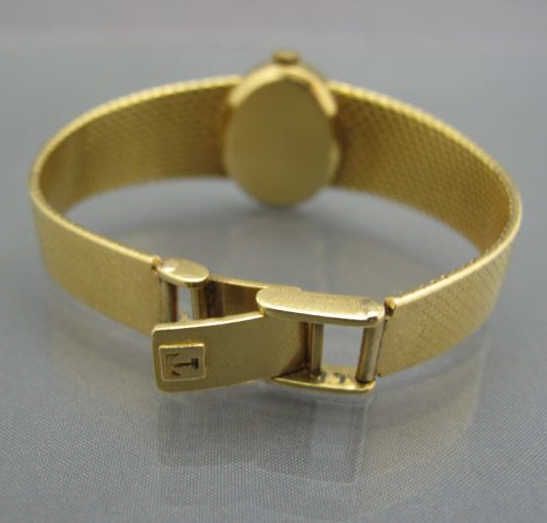-marked oval dial with applied baton markers, Japanese quartz movement, case signed & stamped 18K ‘.750’, tapered woven link bracelet, clasp signed & stamped ‘.750’.