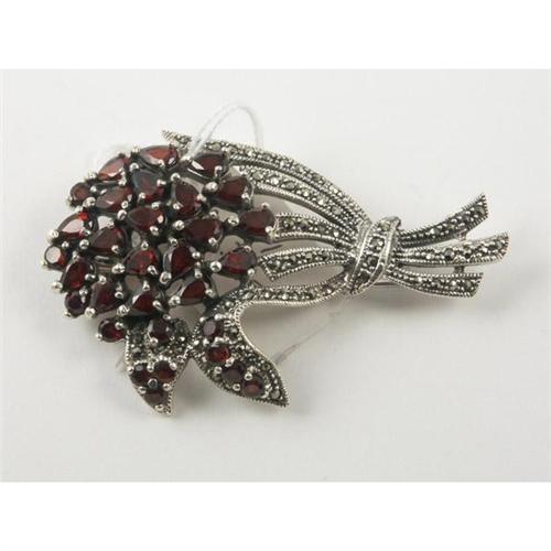 PIN: Lady's sterling silver pin shaped like a flower bouquet set with garnets and marcasites. No appraisal is included with this lot.