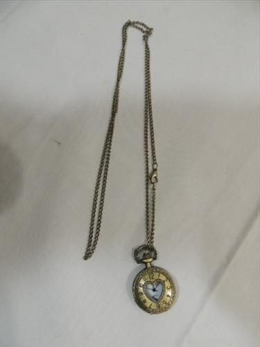 LADY'S POCKET QUARTZ POCKET WATCH WITH CHAIN. HEART SHAPE ON FRONT. AS SHOWN. VIEW PICTURE FOR DETAIL.