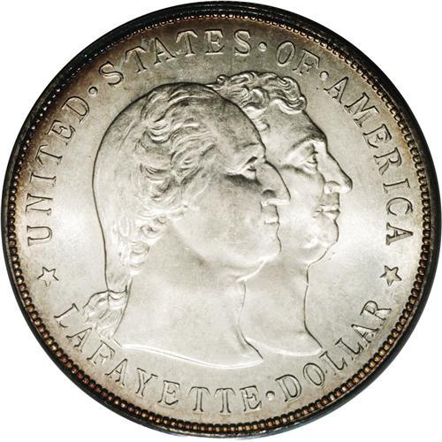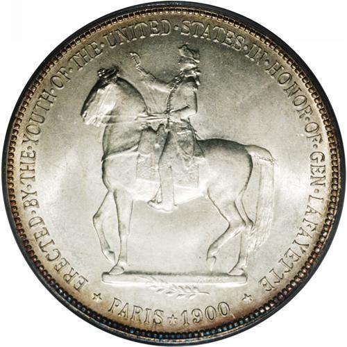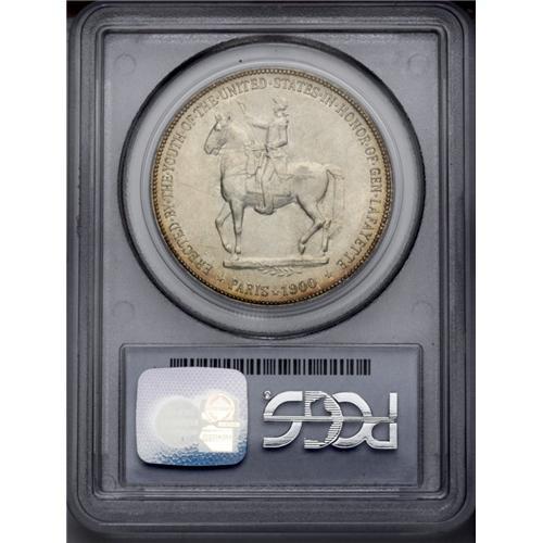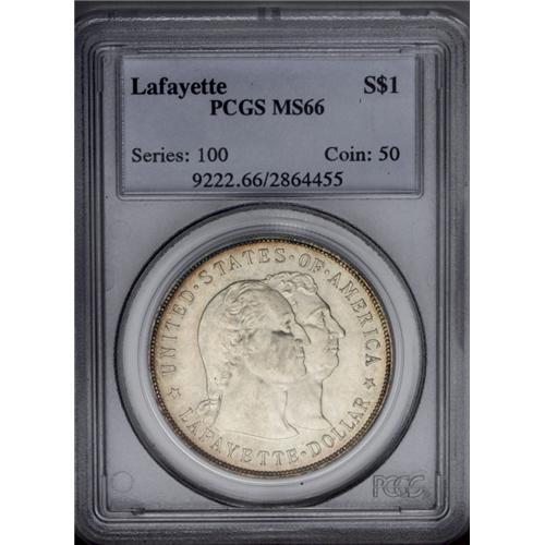 <B>1900<img border='0' src='http://www.heritagecoins.com/images/star.gif' width=10 height=10>$1> Lafayette Dollar MS66 PCGS.</B></I> DuVall 1-B. This is an awe inspiring example of this popular, crown-sized early commemorative. Commems have long been one of the most popular series for collectors and the appearance of a premium quality Lafayette has always stirred excitement. Both sides are lightly toned with peripheral shadings of deep antique-golden color on each side. The otherwise bright surfaces exhibit a vibrant, satiny appearance, being remarkably free of most coin-to-coin contact. The typical Lafayette dollar, an issue that was sold in great numbers to the non-collecting general public, is lightly circulated and often cleaned. Even a pleasing MS63 specimen can be difficult to find. High-end coins, above the grade of MS65, are of the utmost rarity and quickly absorbed by the serious commemorative collector. To this we add that the Lafayette dollar is one of the keys to the U.S. Commemorative set in the finer Mint State grades; few coins display surfaces as smooth and blatantly original as those of the present MS66 specimen. Destined for the finest set. Population: 87 in 66, 5 finer (3/06).<BR><I>From The David L. Goodwin Collection.</B></I> <BR><BR><B>Important notice:</B> Heritage usually auctions material at the rate of 200-250 lots per hour. On some occasions eBay Live bid software or the Internet may not be able to keep up with the pace of the auction. We recommend placing a realistic absentee bid now as insurance to avoid disappointment. Occasionally the auctioneer may eliminate or reject an eBay Live bid, and the auctioneer may also reopen a lot after the close of the eBay live bidding (usually because we missed an audience bid), and may reject your bid even if it shows you as the winning bidder. By bidding via eBay Live, you agree that Heritage may award the lot to another bidder at its sole discretion under the circumstances described above or any other reasonable circumstances. Since eBay bids are not shown to us until we open the lot on the floor, we treat those bids just like floor bids. In most cases the floor responds before the eBay bid is presented to us, due to Internet lag time, so for consistency we have made it a policy that floor bids are always considered first over tie eBay live bids. Also please note that all Heritage lots purchased through eBay Live carry a 20% Buyer's Premium. Please make sure you read the Terms and Conditions before you bid. This lot is being auctioned in conjunction with a live floor auction by Heritage Galleries & Auctioneers. All final auction and invoice information will be supplied by Heritage Galleries & Auctioneers, and all other information should be considered preliminary. Lot:4839 <BR><BR><B>Winning Notification and Billing:</B> After the FINAL session in this auction is complete, Heritage will send e-mail and snail mail invoices. This process normally takes several days. All final auction and invoice information will be supplied by Heritage Galleries & Auctioneers, and all other information should be considered preliminary. <BR><BR>This auction will be conducted on a live auction floor and over the Internet through eBay Live. If you choose to place an absentee bid, please take a moment to <font color='#0000ff'><u><a href='http://pages.ebay.com/liveauctions/help/before/laabsentee.html'>learn how eBay Live absentee bidding works</a></u></font><font color='#000000'>