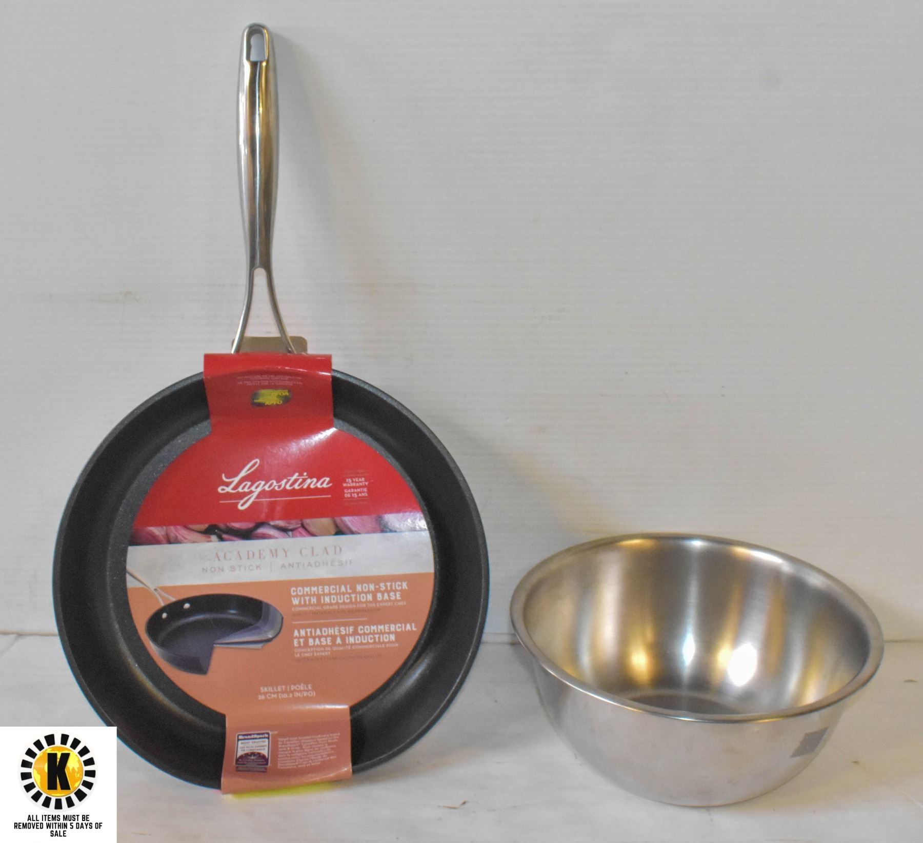 STAINLESS STEEL MIXING BOWL ** SKILLET HAS A DENT OPPOSITE OFF HANDLE **