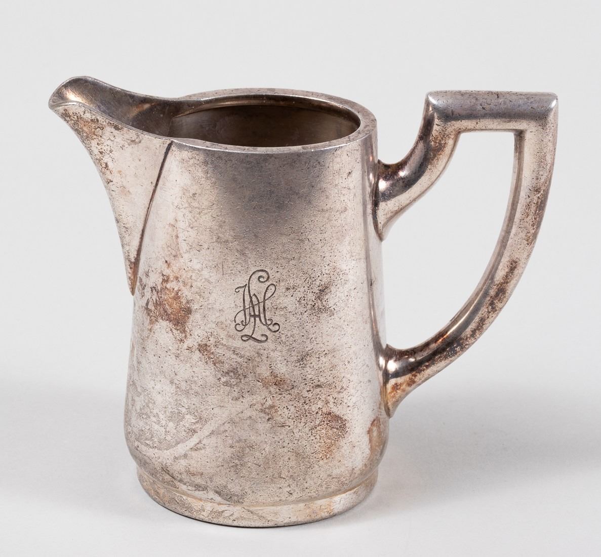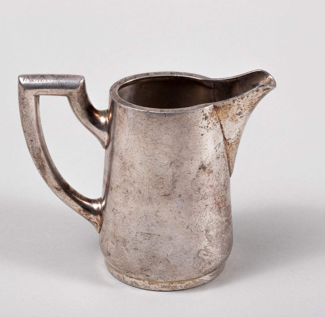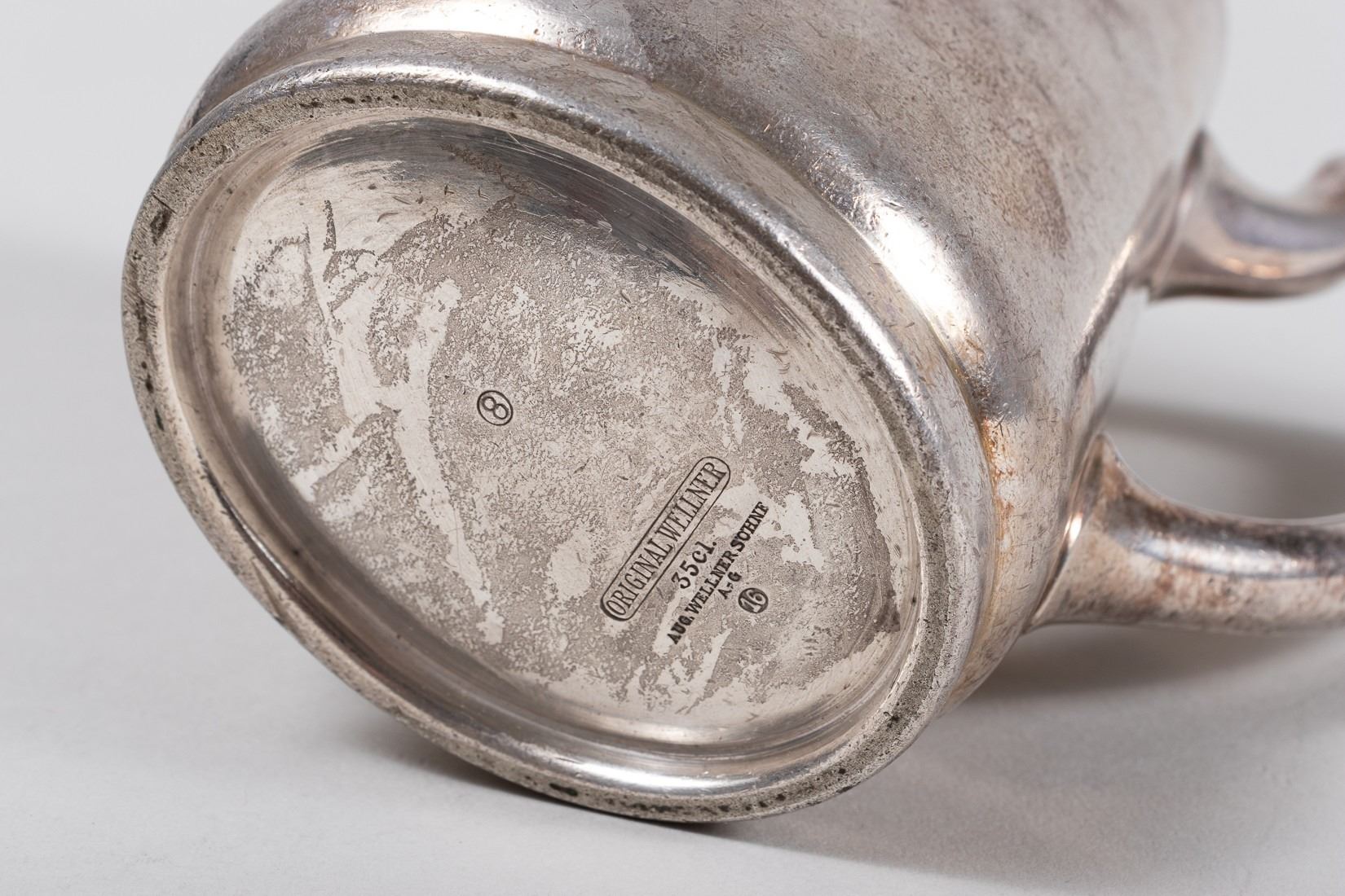 Silver plate creamer pitcher prominently debossed with the logo of the Leibstandarte Adolf Hitler and hallmarked on the bottom 'Original Wellner 35 cl Aug. Wellner Sohne 16.' 4.75 x 6 inches. Some patina and wear as expected from use.