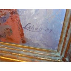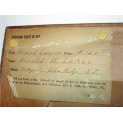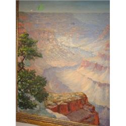 LAHEE, ARNOLD "GRAND CANYON" OIL ON BOARD PAINTING. Depicts view of Grand Canyon. Damage to top left of painting. Labeled on reverse. Signed in lower right "Lahee '39". 28.5" x 34.75" framed.