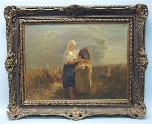 LAJOS NEMTH - 19th Century Hungarian School. "Young peasant girls collecting potatoes in a field". Large oil on canvas in gilt frame. Signed lower right. 23" x 30 1/2". Ref. Benezit, vol.6, page 332. 1300-1500