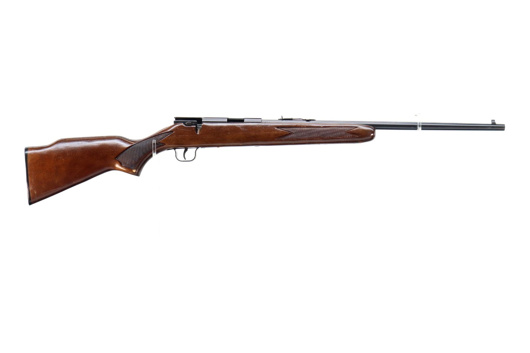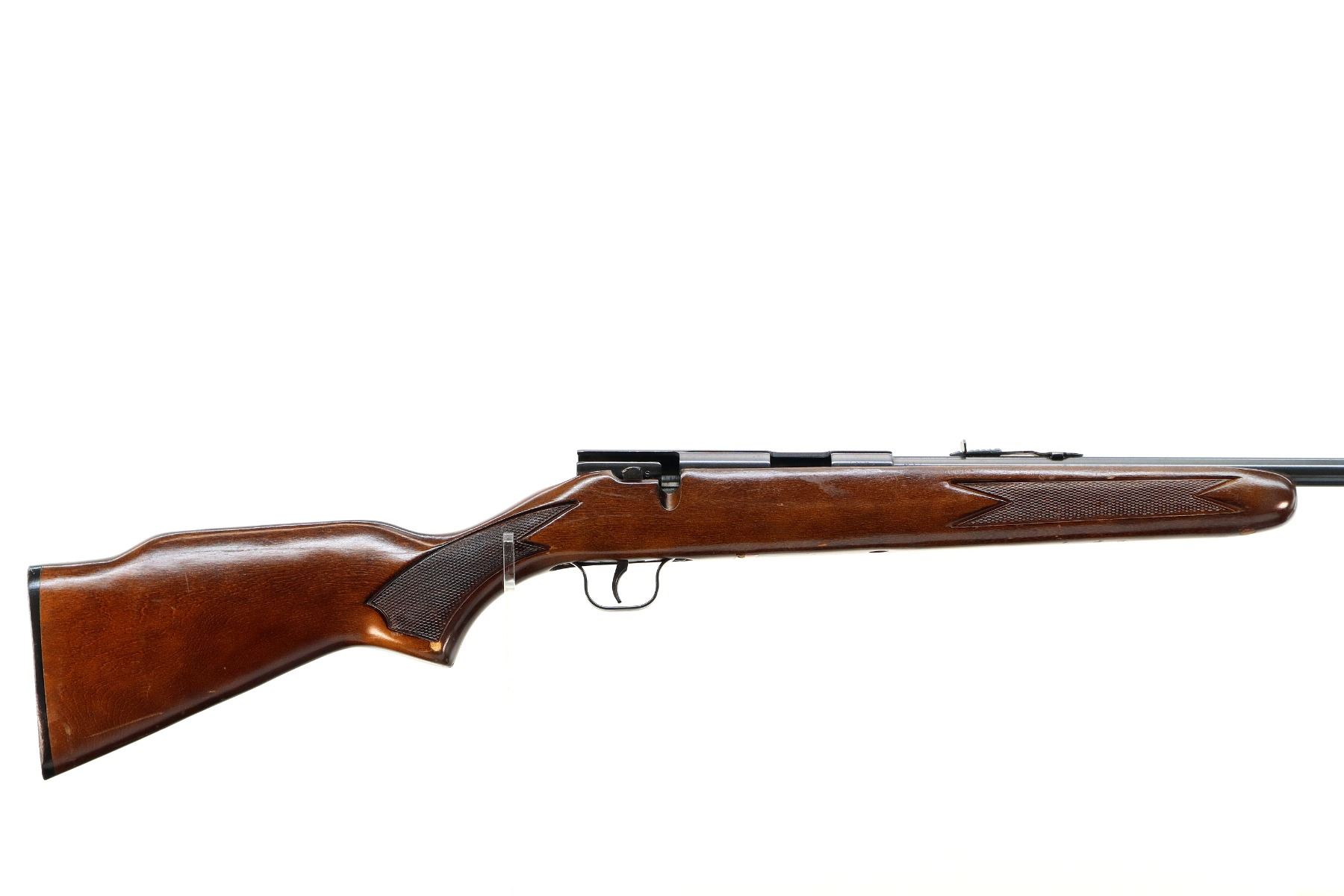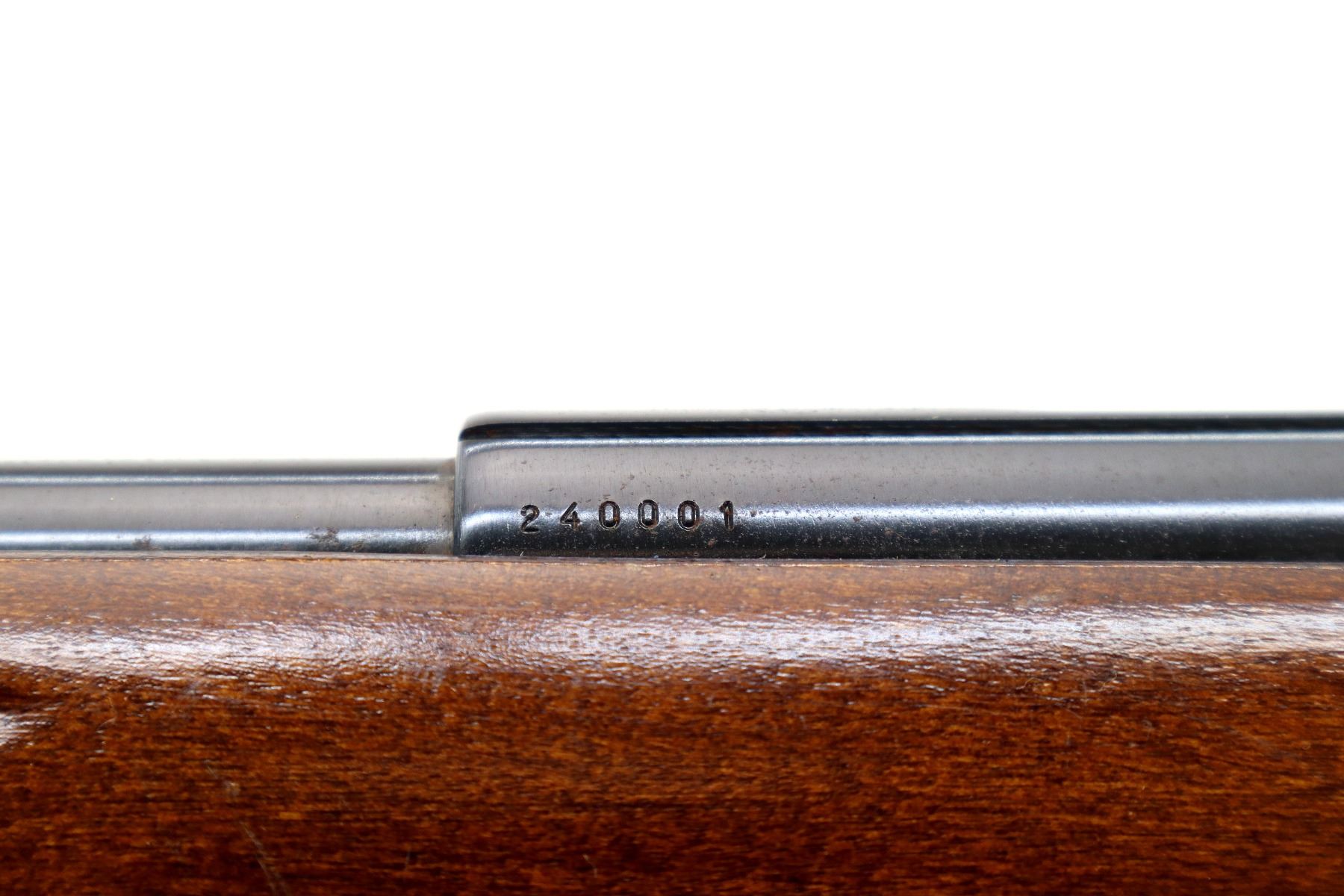 Main Description: Blade front sight, adjustable u notched rear sight, blued finish, grooved receiver, missing complete bolt assembly. One piece wood stock, checkered forearm, pistol grip and black polymer butt plate. Raised comb.