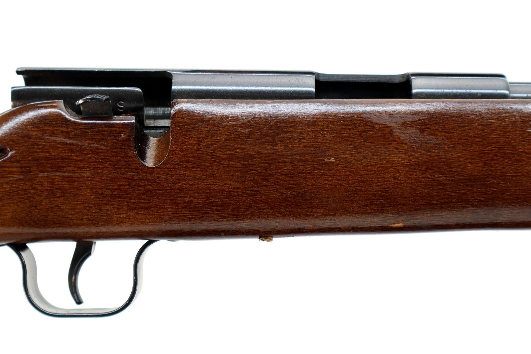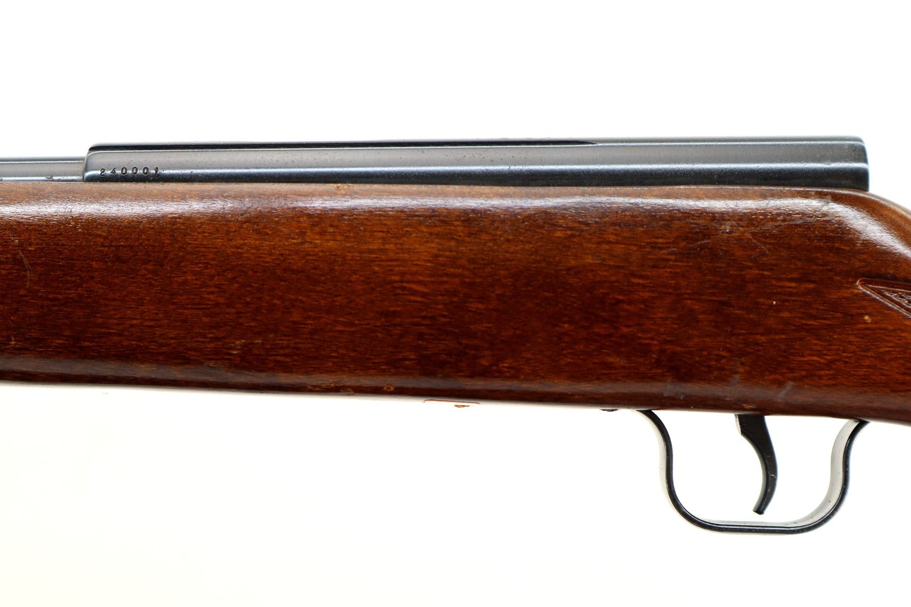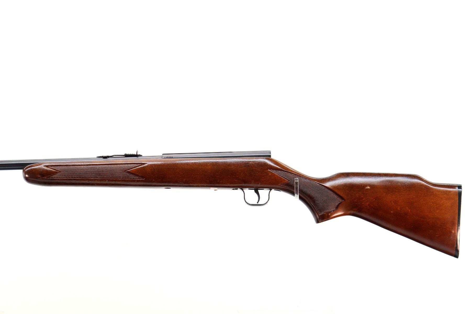 Main Description: Blade front sight, adjustable u notched rear sight, blued finish, grooved receiver, missing complete bolt assembly. One piece wood stock, checkered forearm, pistol grip and black polymer butt plate. Raised comb.