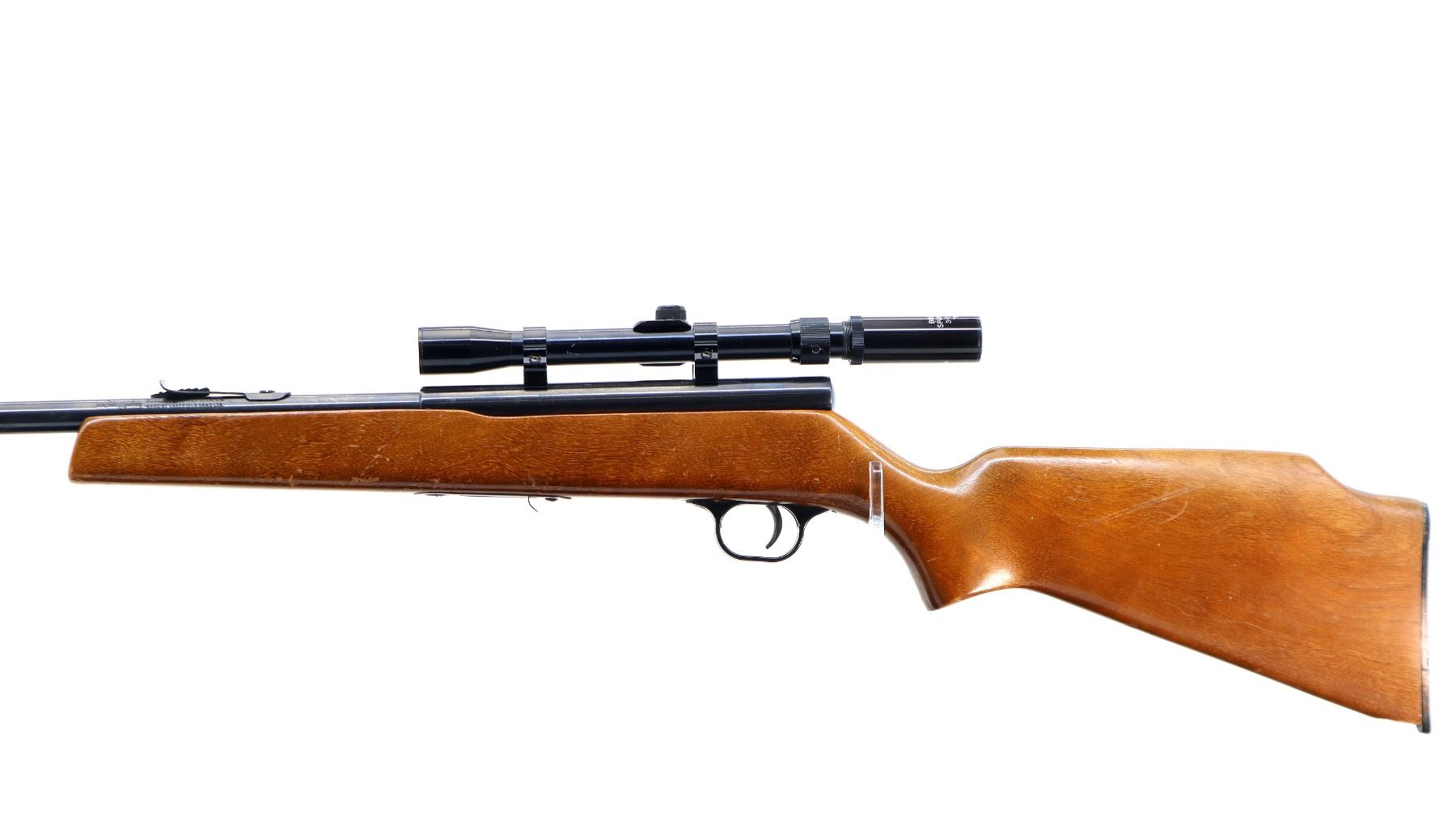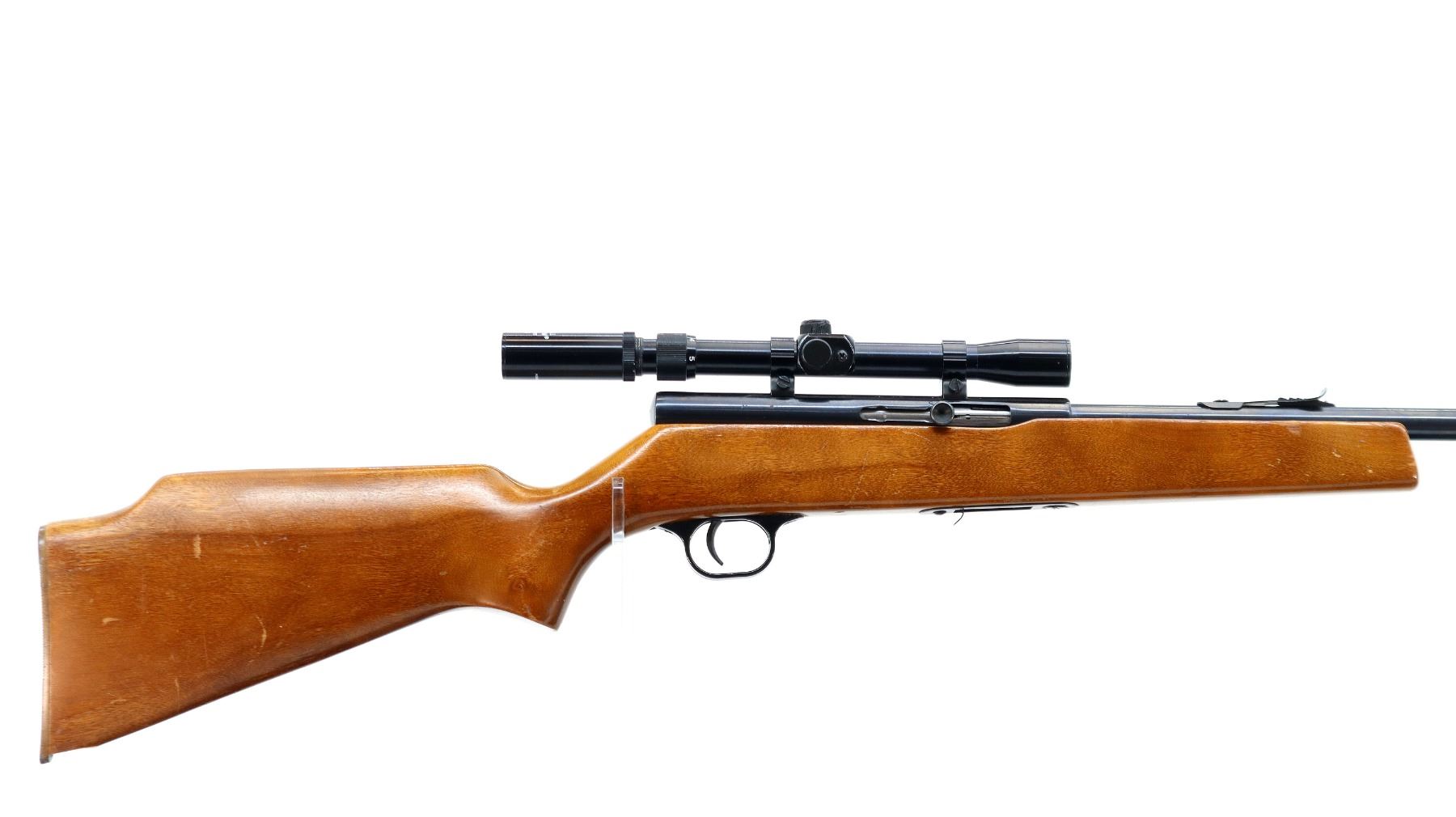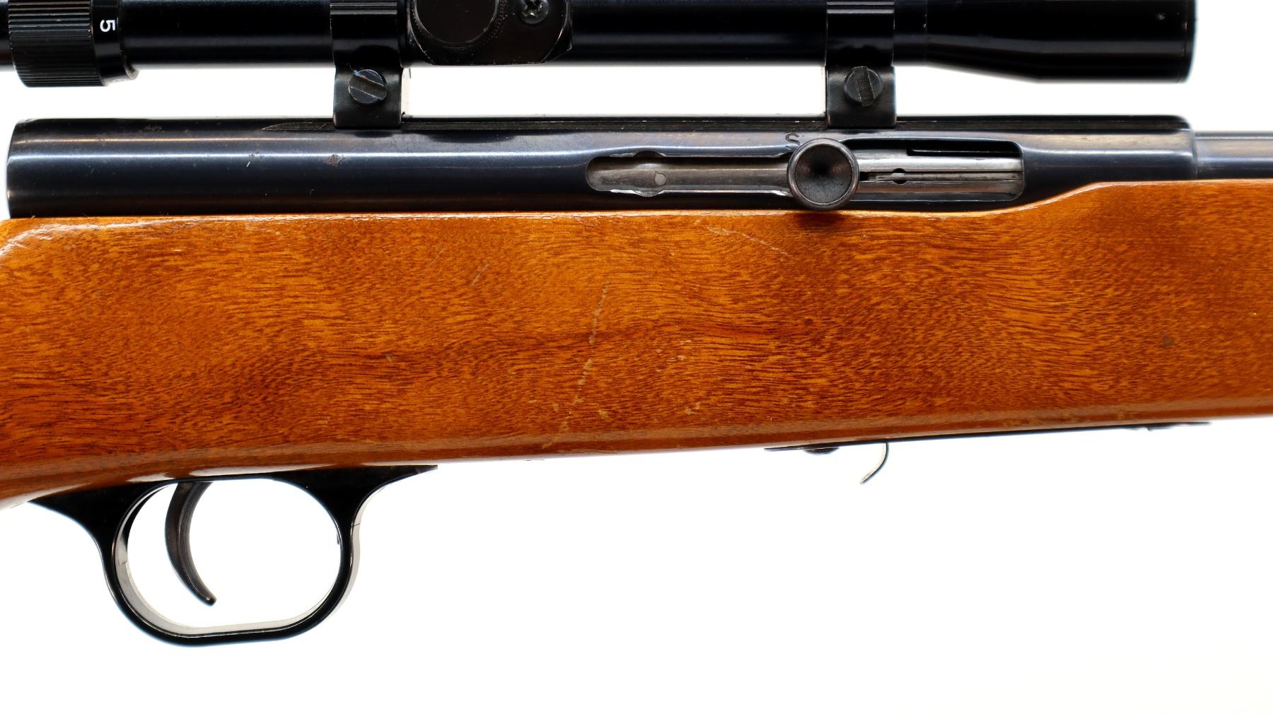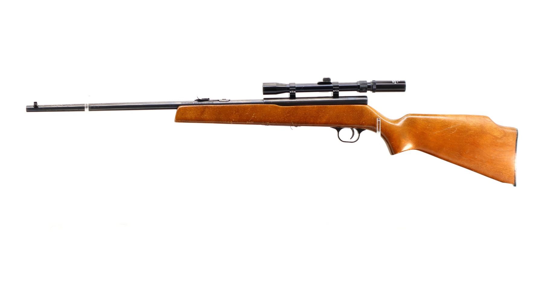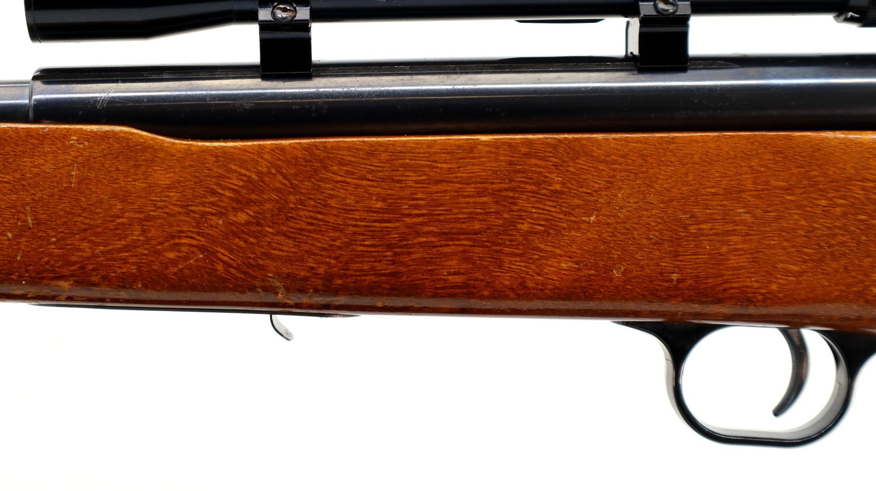 Main Description: Blade front sight, adjustable u notched rear sight mounted backwards, blued finish, grooved receiver with Bushnell sportview 3-7x20 scope mounted, clear optics with duplex crosshair. One piece wood stock, pistol grip, raised comb, grooved black polymer butt plate, stock chipped at toe.