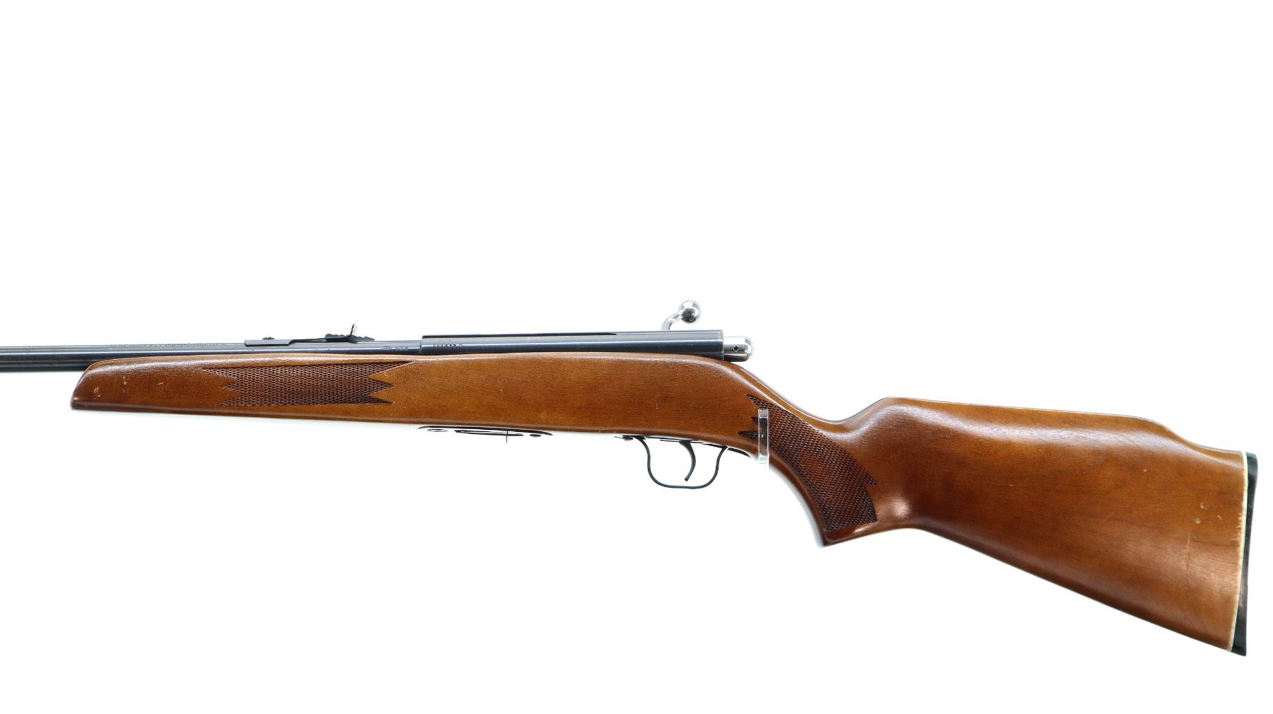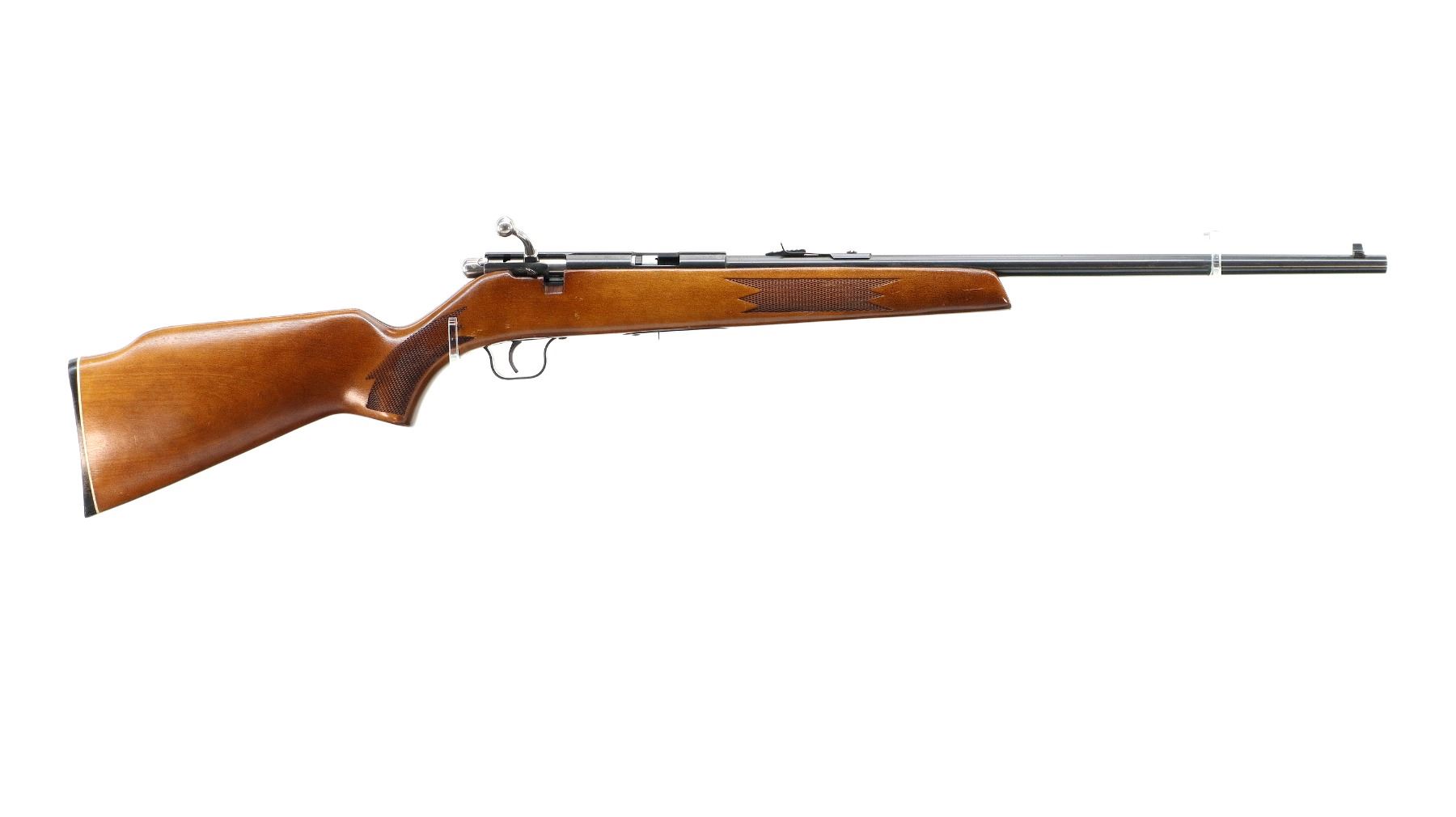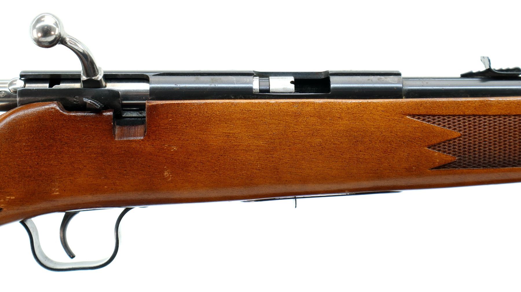 Main Description: Blade front sight, adjustable u notched rear sight, blued finish, grooved receiver, includes incorrect bolt from a different firearm does not function. One piece wood stock, checkered forearm and pistol grip, cheek rest, grooved black polymer butt plate.
