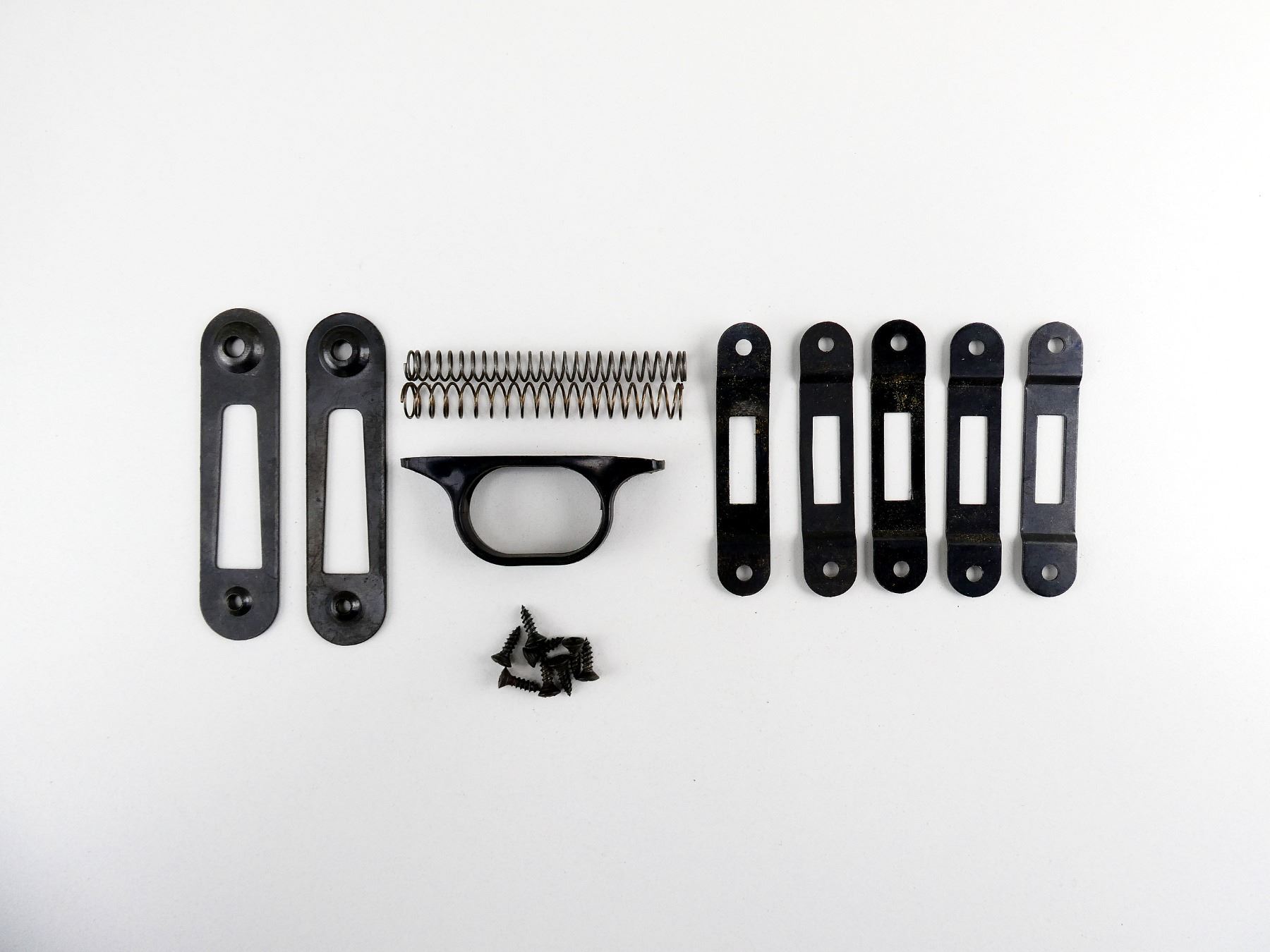 LOT INCLUDES; BLACK POLYMER TRIGGER GUARD, (2) MAGAZINE FLOOR PLAT, (8) SCREWS, (5) TRIGGER GUARD SPACERS, ETC. MAY REQUIRE FITTING. SEE PHOTOS.