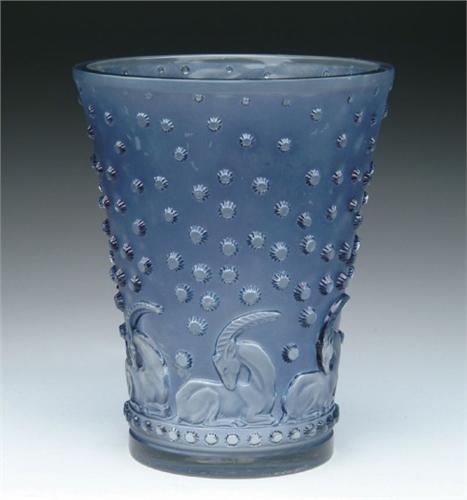 LALIQUE AJACCIO VASE. Outstanding Lalique vase features nighttime scene with a bottom row of sleeping gazelles under starlit sky. Vase is finished with a dark blue patination. Signed on the underside in block letters "R. Lalique". SIZE: 8 in. t. CONDITION: Very good to excellent. 5-61363