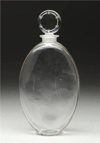 LALIQUE ARYS NO. 2 UNJOURVIENDRA BOTTLE. Nice Lalique scent bottle has simple pumpkinseed shaped body with round stopper impressed with a border design with stars and circles. Marked on the underside with raised letters "ARYS R. Lalique". SIZE: 8" t. CONDITION: Very good to excellent. 5-62449