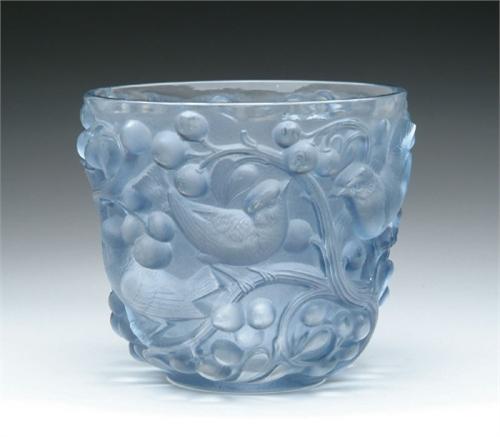 LALIQUE AVALLON VASE. Wonderful Lalique vase has deeply impressed design of birds perched on flowing limbs with leaves and berries. Vase is finished in a blue patination. Signed on the underside "R. Lalique No. 986". SIZE: 5-1/2 in. t. CONDITION: Very good to excellent. 5-61357