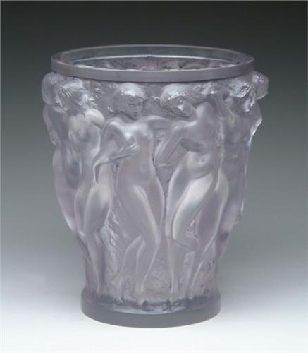 LALIQUE BACCHANTES VASE. Wonderful Lalique vase is surrounded by high relief dancing nudes against a textured background. Signed on the underside with engraved signature "R. Lalique France". SIZE: 9-1/2 in. t. CONDITION: Very good to excellent. 5-61272