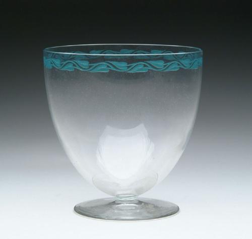 LALIQUE BEAULIEU VASE. Delicate Lalique vase has rim design of intaglio leaves and vines which are patinated in turquoise. Signed on the underside in script "R. Lalique". SIZE: 6 in. t. CONDITION: Very good to excellent. 5-61365