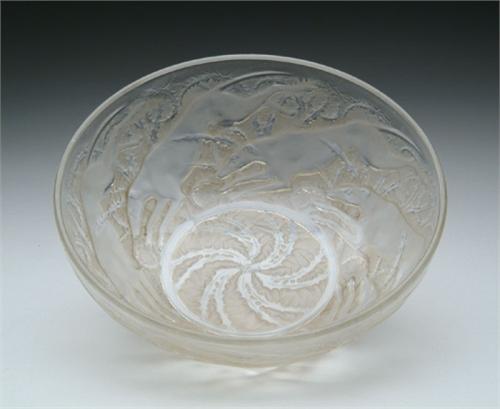LALIQUE BOWL. Interesting frosted bowl has figures of hounds running through briars encircling the bowl. Relief areas of pattern have amber patination. Bowl is marked on outside of lip in script "R. Lalique". Molded in relief in bottom of bowl are initials "V A" superimposed with a "D" and "France". SIZE: 9-1/2 in. dia. CONDITION: Very good to excellent. 5-61356