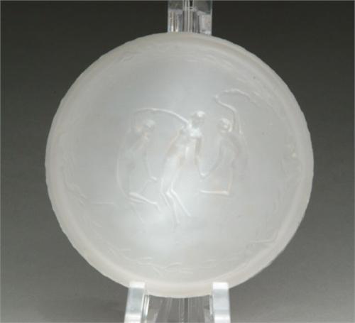 LALIQUE BOX. Beautiful Lalique box has three dancing nudes on the lid while body of box is surrounded by three bands of leaves and stems. Marked on the side of the box "D'Orsay". Signed on the underside in block letters "R. Lalique France". SIZE: 3-3/4 in. dia. CONDITION: Very good to excellent. Collection of Dr. C. and Margaret Chastain 5-61438