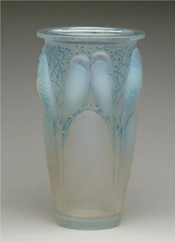 LALIQUE CEYLON VASE. Very beautiful Lalique vase is surrounded by pairs of parakeets with limbs and leaves behind. Vase is finished with blue patination and marked on the underside "R. Lalique France". SIZE: 9-1/2 in. t. CONDITION: Very good to excellent. 5-61569