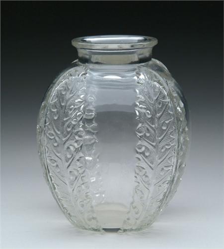 LALIQUE CHARDON VASE. Lovely Lalique vase has squared corners, each impressed with a thistle leaf design. Signed on the underside in block letters "R. Lalique France". SIZE: 7-1/2 in. t. CONDITION: Very good to excellent. 5-61364