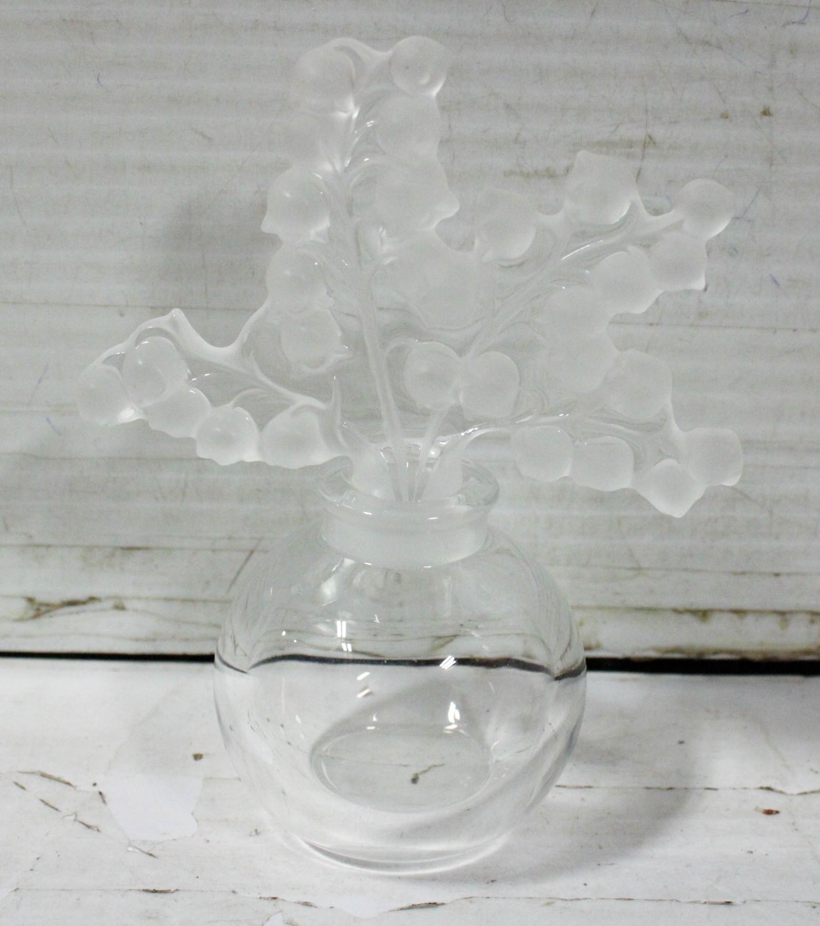 BOTTLE LILIES OF THE VALLEY, CRAFTED IN FRANCE, CRYSTAL, SIGNED/ETCHED "LALIQUE-FRANCE", 5" H, NO CHIPS, CRACKS OR FRACTURES
