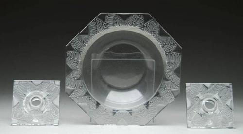 LALIQUE CONSOLE SET. Very nice console set consists of bowl and two candleholders. Rim of bowl and candleholders are impressed with a frosted stylized leaf design. Bowl is signed on the underside in etched script "Lalique France". SIZE: Bowl: 11-1/4" dia. Candlesticks: 4-3/8" sq. CONDITION: Bowl has small nick on underside of lip, otherwise very good to excellent. 5-62431