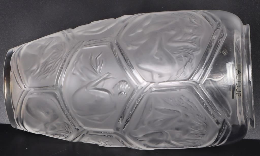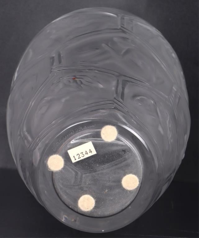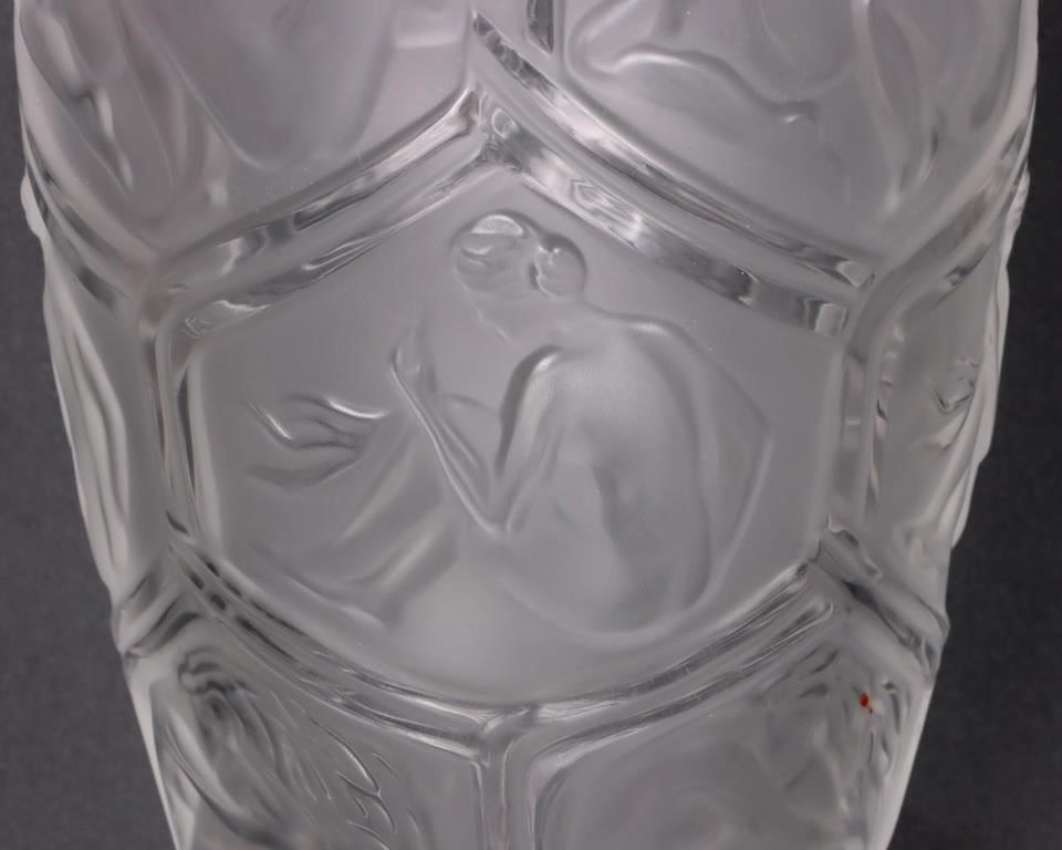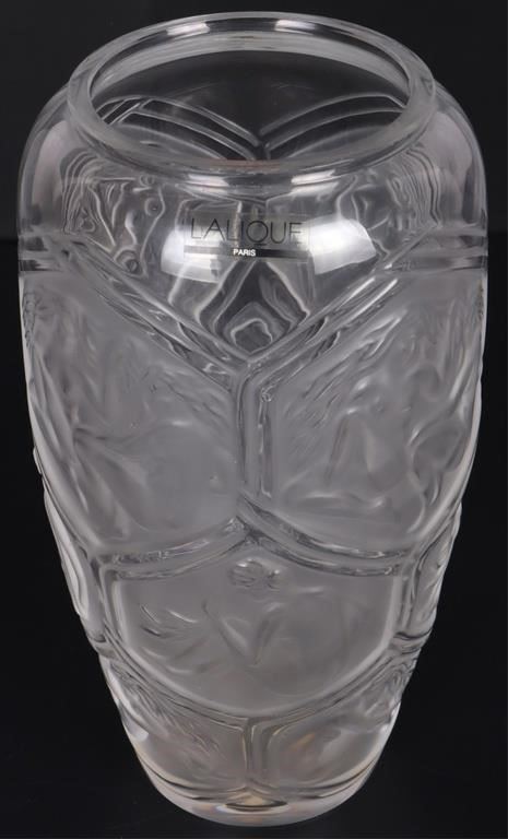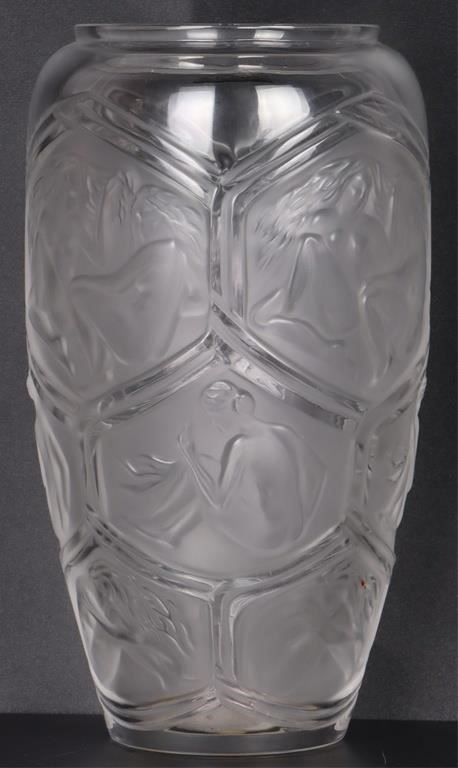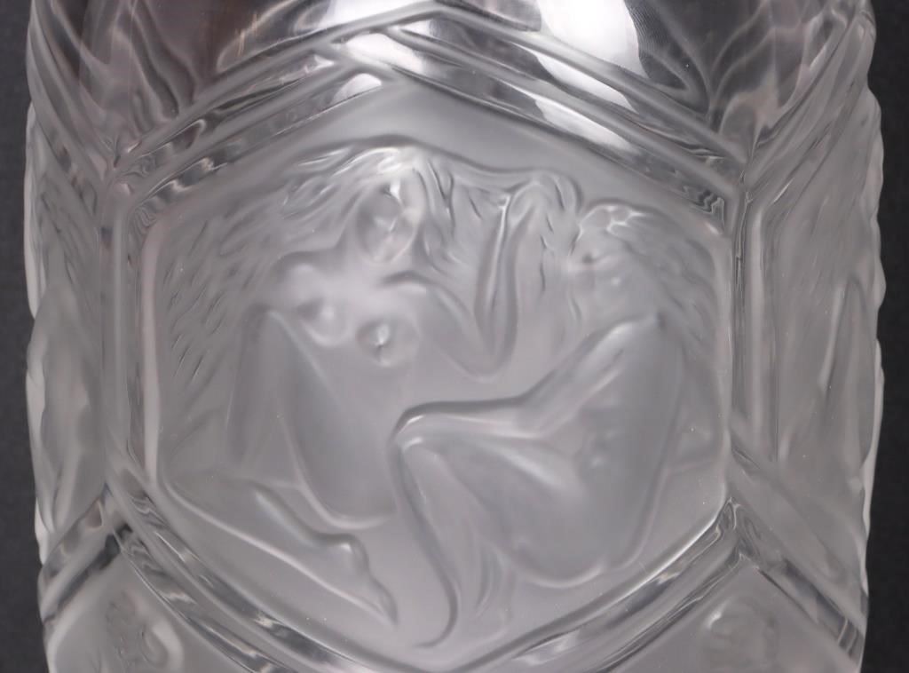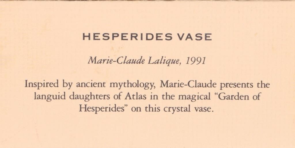 Lalique crystal Hesperides clear vase, 1991. Inspired by ancient mythology, Marie-Claude presents the languid daughters of Atlas in the magical "Garden Hesperides" on this crystal vase.