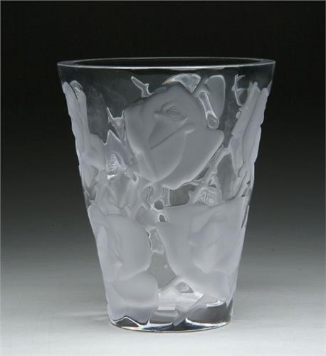 LALIQUE CRYSTAL VASE. Beautiful large clear crystal vase with frosted rose blossoms and thorns. Signed in script "Lalique France". SIZE: 9-1/2 in. t. CONDITION: Very good to excellent. 5-60283